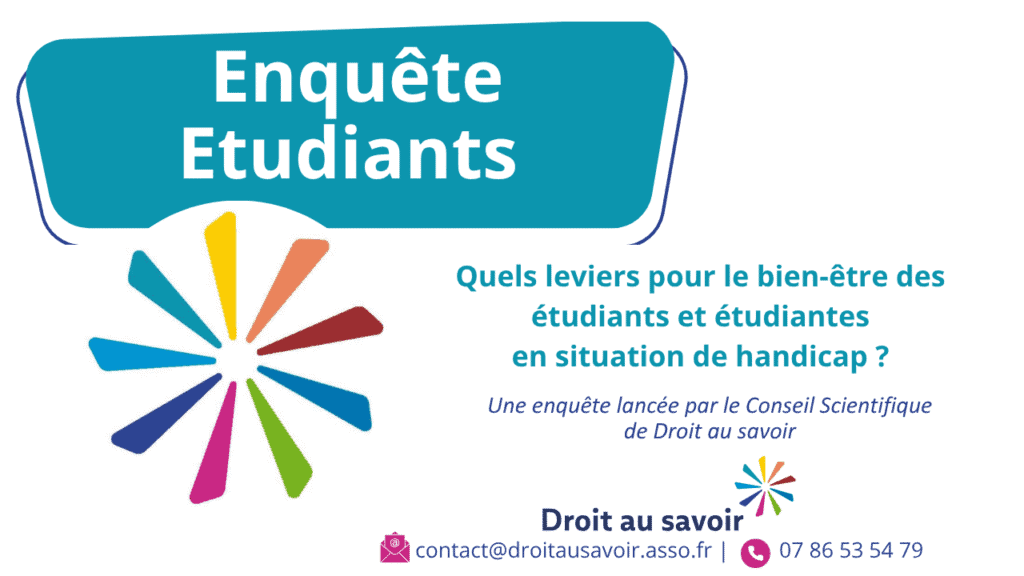 A destination des étudiants postbac en situation de handicap, jusqu’à deux ans après la fin ou … Lire la suite de Participez à notre enquête nationale sur le bien-être étudiant des jeunes en situation de handicap !